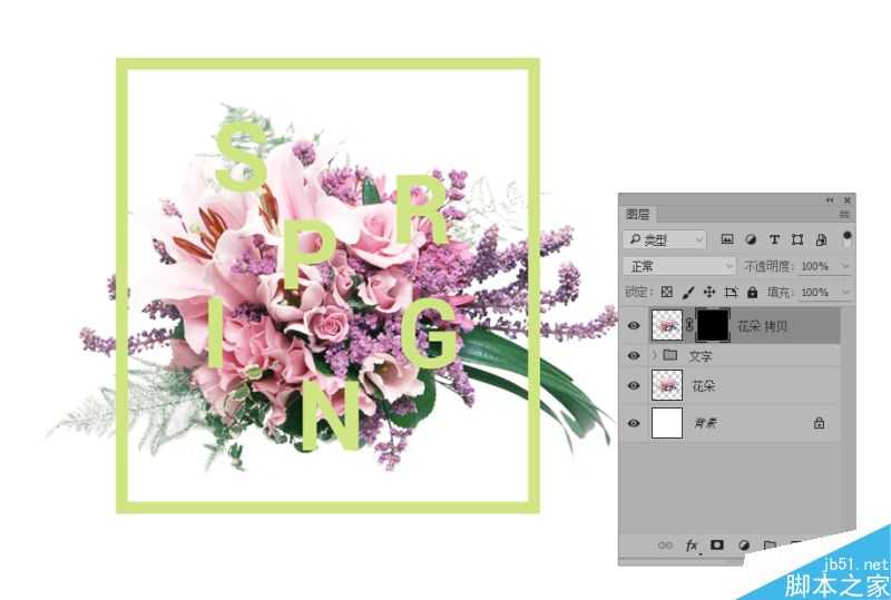 文字和边框这几个图层编排为一组,然后复制花朵的图层放置最上方。文字组就夹杂在两个花朵层的中间,就像一块夹心饼干。将最上方的花朵层增加一个蒙板,蒙板全部填充为黑色,这意味着这时的蒙版几乎没有发挥任何遮挡的作用。因此从外观上看,任何变化都没有发生,实际在图层面板中才能看出我们做了大的调整。