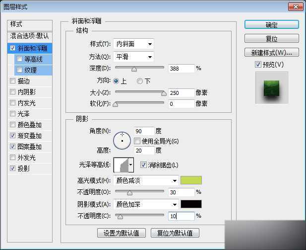 ④为了更有光泽,调整斜面和浮雕。高光#c5d955,阴影#000000。