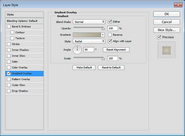 2、双击Background_copy图层,勾选渐变叠加,并设定以下数值 勾选仿色复选框;样式:径向;缩放:150%;创建渐变,左边颜色为#c8c5b8,右边颜色为#aaa593。