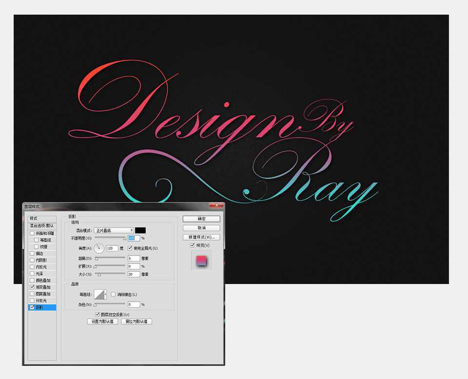 应用渐变叠加后,让我们为图层增加一个投影。虽然,在暗色的背景上应用投影看起来不那么明显,但是我们要知道的就是,不管一个小小的效果是否能第一眼就引起注意,正是这些细节部分才能构成最终效果,所以不可轻视。这个投影的模式为正片叠底的黑色投影,透明度为100%,距离为5,大小为20,方向为120度。详细的参数参考如下图。