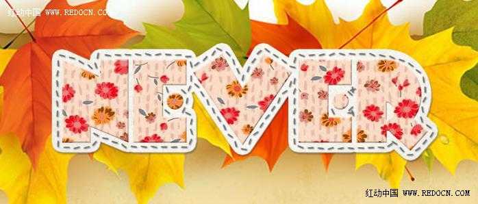 效果图虽然简单,不过制作的时候有点复杂。首先要做出描边的文字,描边部分要加上一些特殊的纹理和投影;然后给文字部分加上想要的布纹,同时用投影做出立体效果;再给文字描上缝纫线条即可。