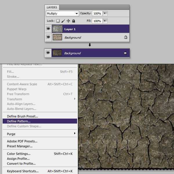 现在我们将对三个文字版本中的常规版本进行一些图层修饰。在这之前,我们需要进行一些其他的操作。下载并打开素材 Crackles0014 ,执行Ctrl + A ,再执行编辑>自定义图案,命名为”裂缝模式”。