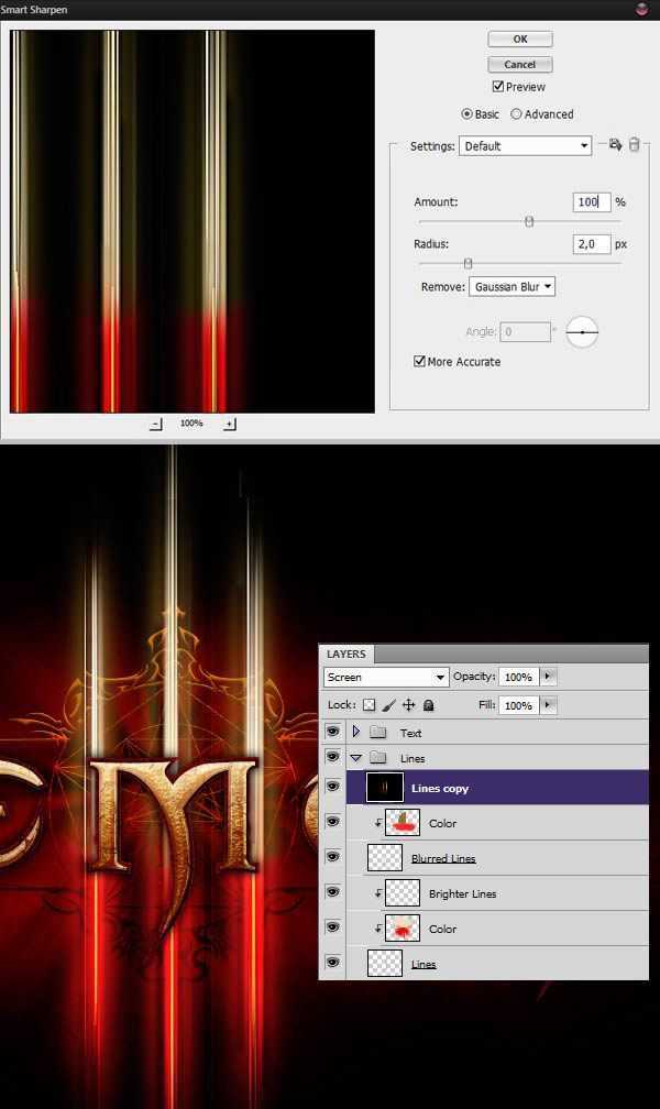 为了让设计更加完美,让我们来添加一个智能锐化过滤器。将几个图层组合并到一起,执行滤镜>锐化>智能锐化,并添加下列数值。