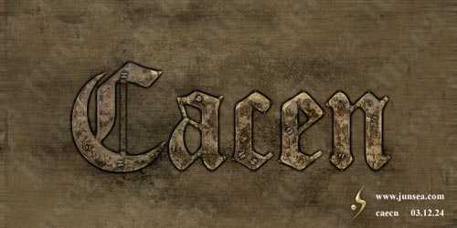 13.好了,一排铁锈的文字就完成了,对颜色的不满可以通过调节‘色彩平衡’,或‘色相/饱和度’来修改,并可在最底层的文字图象上使用一次烙黄的命令,可将细节设置为10,平滑度设置为0,这样处理后的文字看起来的金属感就更强了。如果改变各图层的混合模式的,并配以合适的底纹,那将能得到各种不同的效果。(图14)。