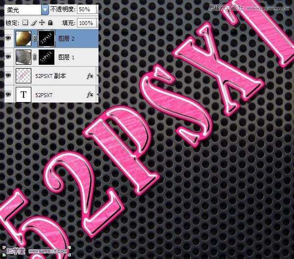 10.将素材2拉入画布中,摆放在所有字体图层上面,改图层模式为柔光,不透明度75%。ctrl+T进行适当的倾斜,按住shift键点击字体副本图层得到选区,添加图层蒙版