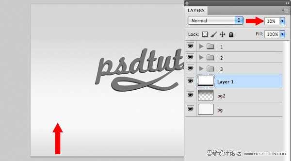 23、在“bg 2”上新建一层,命名为“bg 3。选择渐变工具,按一下D键将前景色和背景色分别设置为黑色和白色。用前景色到背景色渐变在文档的底部拉一个新的渐变,将该层不透明度设置为10%。群组这三个新的图层,命名为“background”。