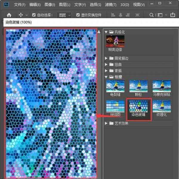 滤镜库打开之后,我们在【纹理】的下面选择【染色玻璃】,如图所示。