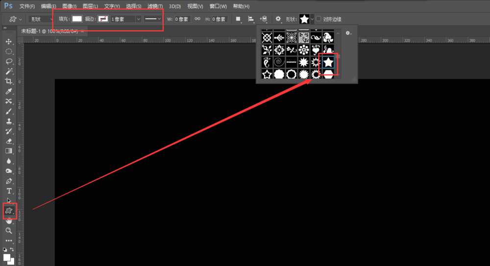 3、用鼠标左键选中矩形工具并长按,弹出矩形工具工具栏窗口,在弹出的工具组中选择自定形状工具;然后在上方的形状中选择一个五角星的形状,设置填充颜色为白色,描边颜色为无。