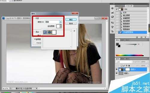6、选中“图层1”,单击“编辑”菜单下的“填充”,在弹出对话框中选择“图案”中刚才保存的“瓷砖”图案,并点击“图层”中“图层蒙版”下的“应用”按钮。