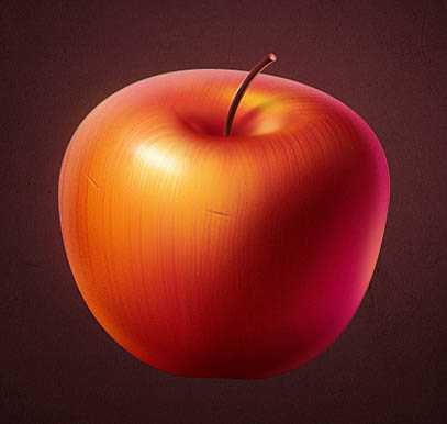 苹果其实跟球体的结构类似,只是苹果轮廓不是很规则,顶部的面构造稍微复杂一点。大致过程:先做出轮廓,填充基色,然后慢慢处理中间及边缘的暗部及亮部即可。最终效果