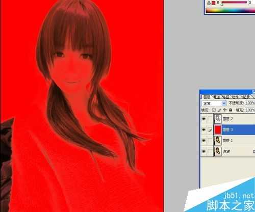 8、垫一层红色背景看一下效果,并将人物的主体用钢笔抠出来。
