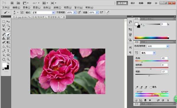 6、当选择前景色为白色的时候,图片中的调整的花朵颜色会随之进行变化,表示的是没有被遮住的图层,所以颜色才会进行调整,当已经被遮住的图层为黑色时候,那么颜色肯定是用画笔显示的是原有图片的颜色,这个是非常值得多去练习的。