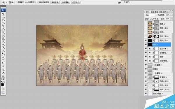 把斗笠人物抠图羽化2个像素,这样人物边缘过渡比较自然,调整合适大小置入场景,添加蒙版由下往上拉渐变过渡虚化,依次复制多个。 把躺在地上的人物抠图调整进来,给人物手上加上红缨枪。以近大远小、近实远虚依次复制排列,每一行稍降不透明度,增加空间效果。中间主人物衣服色调处理成红色,帽子用斗笠拼接合成突出王者之范