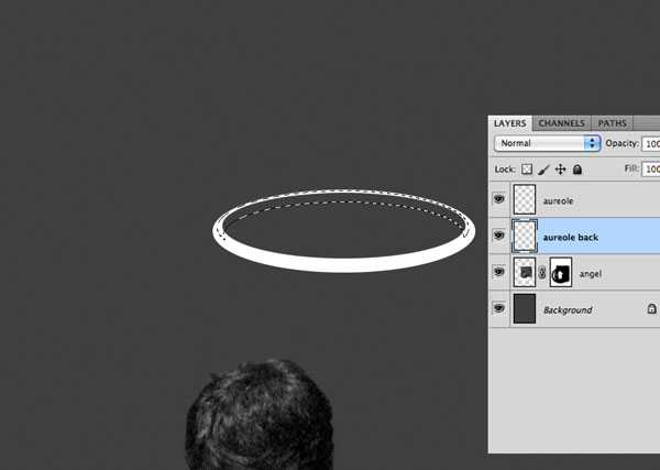 3、现在我们为天使创建一个光环。新建图层命名为“aureole”,用椭圆形选框工具(M)创建一个椭圆选区,填充白色。