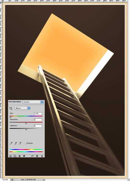 step8点击图层>新建调整图层>色相饱和度。这一个调整图层在其他图层(梯子图像的图层和背景图层)之上,设置亮度为12。