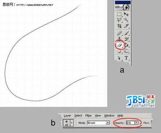 6. 为了以免再有其他人骂我骗子,可以暂且将画了丑头发胚子的图层关了,我知道很多人一直对它不满,而且忍了很久了。拿起橡皮擦Eraser Tool(图a),小心把头发两端处理一下,所谓小心,就是指将Opacity值调低一点(图b),否则你的橡皮擦将比剪刀更生猛。