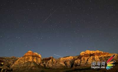 09年摄于美国拉斯维加斯附近的红岩峡谷,流星的轨迹和飞机的轨迹即将交会
