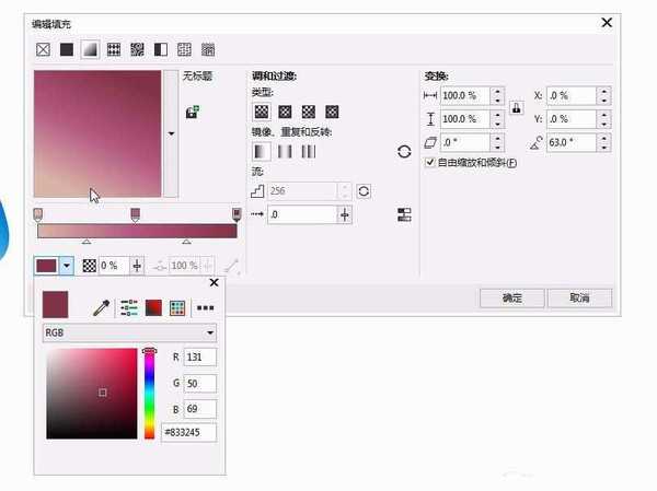 3、按F11使用渐变填充工具给图形填充一个合适的颜色。颜色值分别为1:#A9DDF5;2:#0087D5;3:#1E4976;如图所示。这边需要注意的是色条加色是双击,添加色块,减去色块也是双击。角度改为63°。右键××去掉轮廓线。