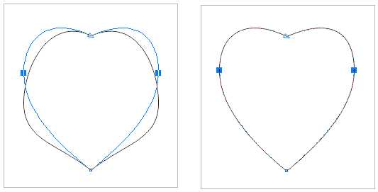 4. 然后框选住中间的两个节点,按住Ctrl键,拖动鼠标左键垂直向上拖动,如下图(左)所示。到适当位置,松开鼠标,确定图形,一个心形的图形框架就出来了,如下图(右)所示。