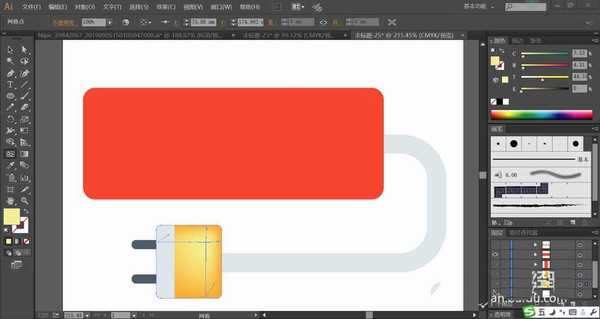 3、设置橙红色填充排插的矩形主体路径,再用橙黄色与灰色搭配填充电线与插头,前端的金属插头用灰黑色填充。