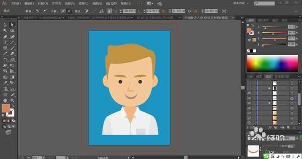 2、使用蓝色填充背景,用土黄色填充头发,用粉色填充脸蛋,用暗粉色填充脖子,再用灰白色与灰色搭配填充衬衫的路径。