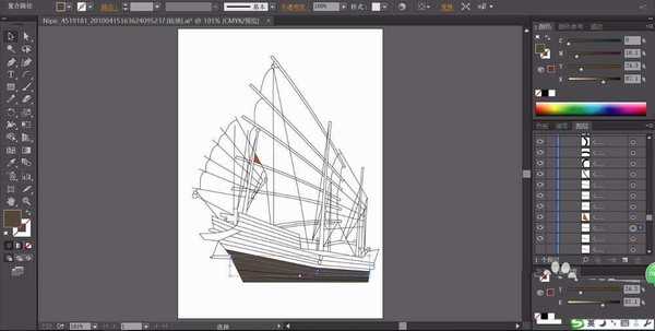 2、画好帆船上所有的元素的细节,我们用钢笔调整一下它们的形状,让船帆的边缘更加的平滑。