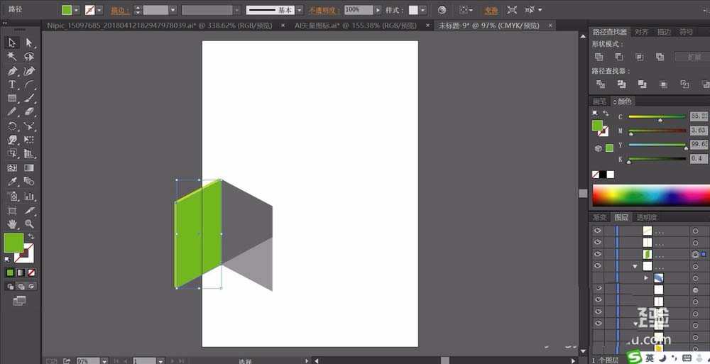 5、我们用不同明度的绿色填充阶梯的路径,让顶端稍亮,正面稍暗一些,右侧面最暗。锁头用橙色的渐变填充。
