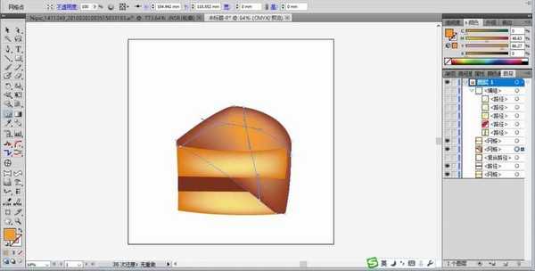 2、我们用橙黄色与咖啡色搭配填充小蛋糕的正面与顶端。