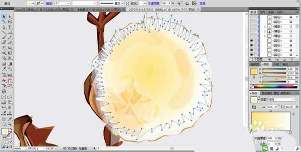 4、这一步开始绘制棉树花的棉花,我们画出棉花的路径并用黄色到白色的径向渐变填充,高光区域用半透明的白色填充,暗光区域用半透明的橙色填充。