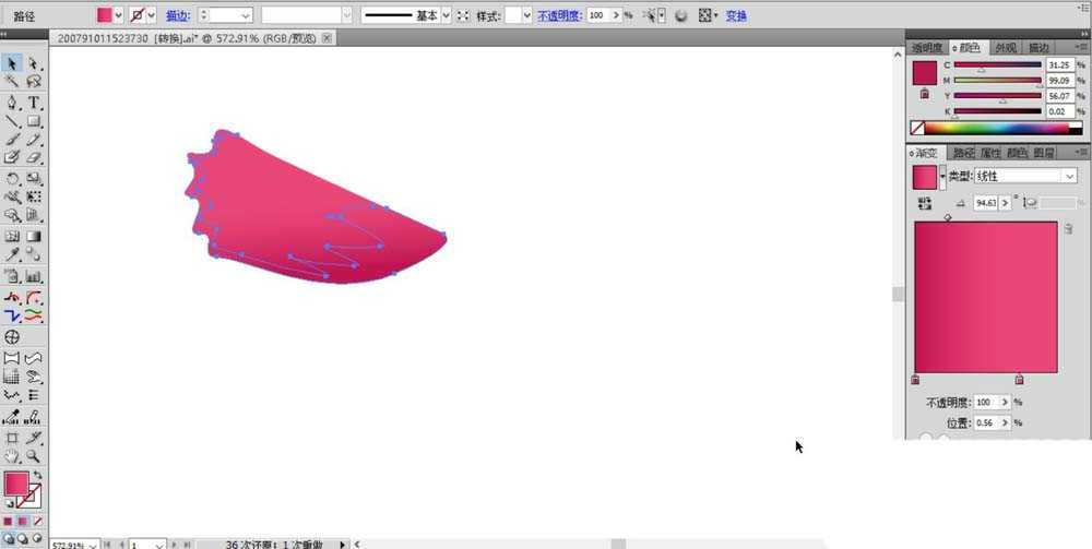 1、首先,我们用钢笔画出一片花瓣的形状,注意边缘的曲线部分,我们用深粉红色的渐变填充路径。