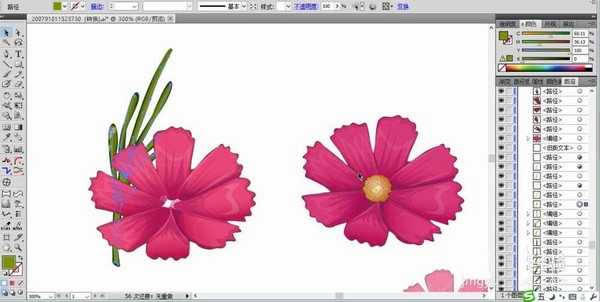 6、接着,我们用同样的办法绘制出粉色的波斯菊,只要设置渐变色为粉色渐变就可以,其它的方法不变。让粉色的波斯菊在红色的波斯菊上面。继续画出枝条在右侧与中间。