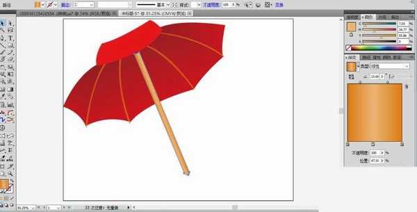 2、继续画出三个封闭路径,用不同的明度的橙红色的渐变填充,这就是沙滩伞的内部区域。