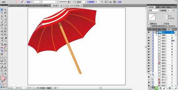 5、这一步开始绘制沙滩伞表面的白条,我们用钢笔一一绘制出来,中间用白色填充,两边用粉色填充并设置为半透明的效果。