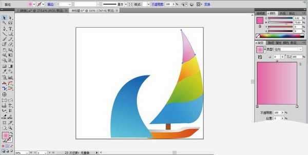 4、接着,我们使用钢笔工具在帆船的风帆上面绘制图案,一共分成上、中、下三个部分,上面填充紫红色的渐变,中间填充橙黄色的渐变,下面填充绿色的渐变。