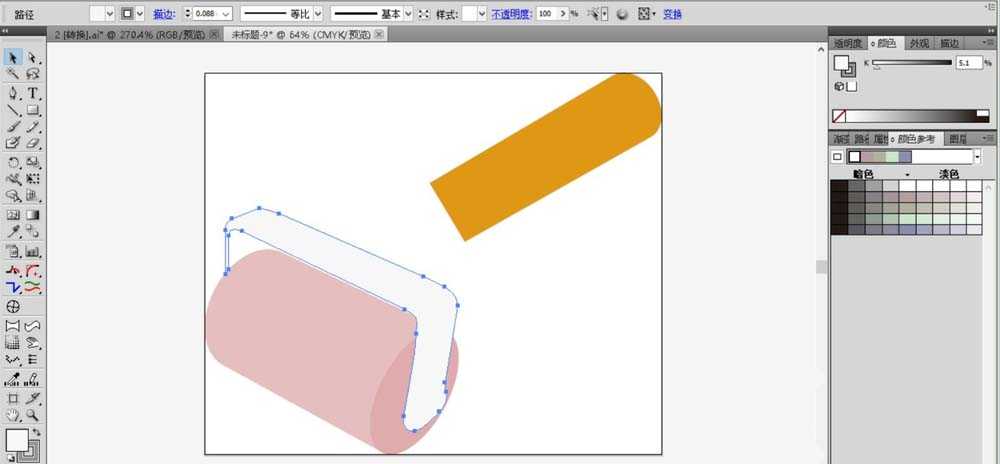 2、继续使用圆角矩形工具画出滚筒刷的圆筒、以及它的右侧面,我们用粉色填充圆筒,用暗粉色填充圆筒的侧面。