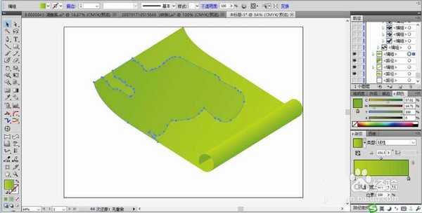 1、先绘制出放置望远镜的纸片,我们要绘制立体感觉的纸片就要把它分解成两个部分,一个是平面部分,另外一个就是侧面卷边部分,我们用绿色的渐变填充平面部分的路径,再调整一下渐变的角度让卷边的部分的绿色渐变较暗。