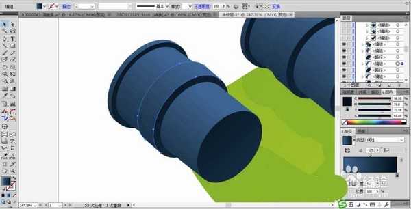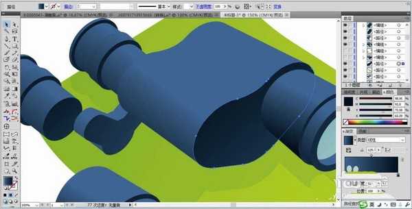 3、有了底色与背景元素之后,我们就可以着手绘制望远镜的部件了,先绘制望远镜底部的零件,我们设置一个蓝黑色的渐变,分别调整较亮区域与较暗区域的渐变角度,从而让同样的渐变在不同的区域呈现不同的色调。有了一个圆筒部件之后就可以复制出另外的一个圆筒部件。
