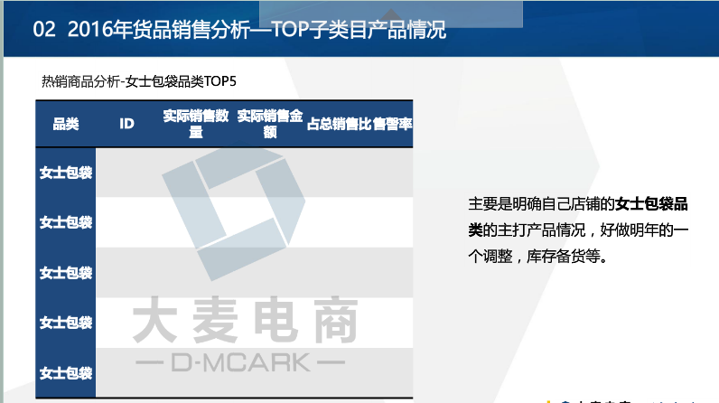分析完店铺的子类目以及产品数量、价格之后,再细分,分析的就是子类目产品情况。以店铺为例,分析店铺热销包袋的Top5,除了作为明年库存备货的参考以外,通过分析箱包存在的共性,比如:手提、印花、水桶型等总结出来,也可以作为明年产品上新选款的参考。