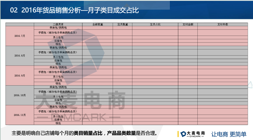 仅仅做子类目是不够的,重要的是要把数据整合到一个月的去分析,主要是明确自己店铺每个月的类目销量占比,产品品类数量是否合理。每个月、每年做一次这样的分析,也有利于未来货品分析的统筹和规划。