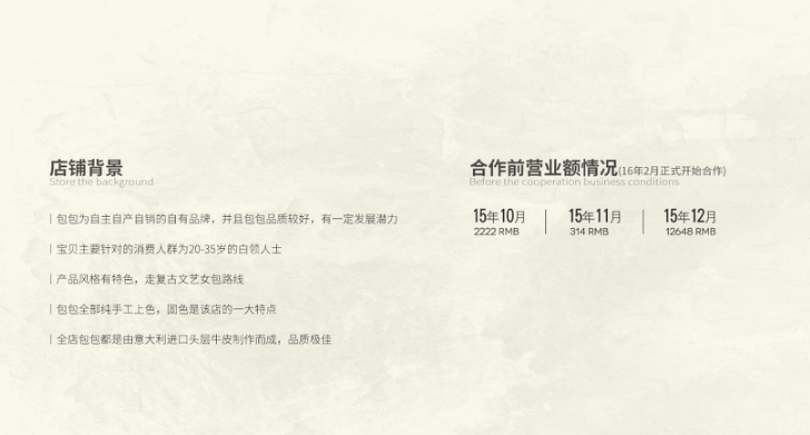 今天主要是以这个店铺为例给大家做分享,首先看一下店铺背景,店铺主营真皮复古女包,2月份正式上线。