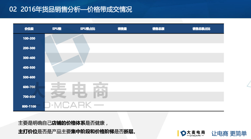 这一分析主要是明确自己店铺的价格体系是否健康,主打价位是否是产品主要集中集中阶段和价格阶梯是否断层。