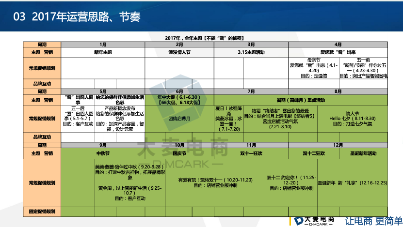 上图是去年的一个运营方案图,首先给店铺定好大主题:不能“雪”的秘密,进而划分到每个月都有一个小主题,虽然小主题不一样,但大方向是围绕大主题展开的。每个活动定好一个目标,一是品牌的传播;二是通过什么营销手段去达到预定目标。