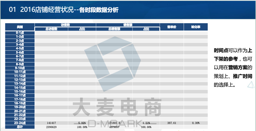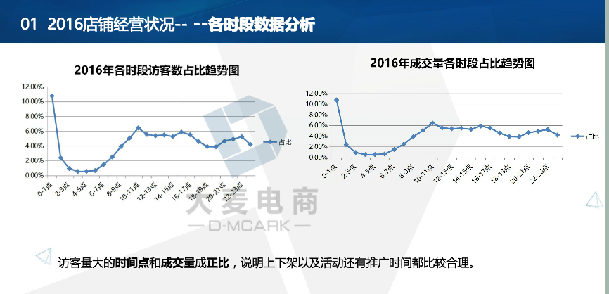 上图是全年各时段数据分析,24小时各个时间段成交占比,做这个数据分析的好处:时间点可以作为上下架的参考,也可以用在营销方案的策划上、推广时间的选择上;更大的意义在于,通过时间点可以看出某一时间段访客流量大,商家可以对照有没有通过某些推广方式来引流、推广的时间是否集中在流量高峰期,以此回顾一年所做活动及推广时间,用于审视店铺的推广营销是否合理。举一反三,客单价和转化率可以用同样的方式去做。