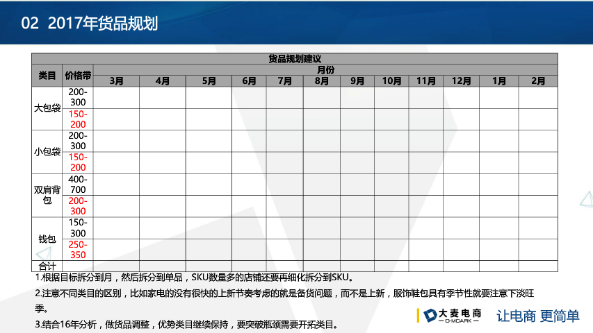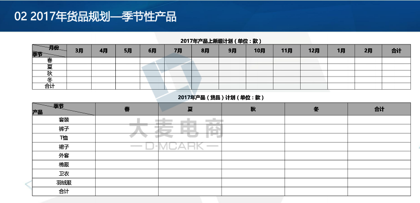 上图是季节性较强类目应该注意的,如鞋包类、服饰类等,将目标分四季进行拆分,再细分到子类目,如套装、裤子、T恤等。