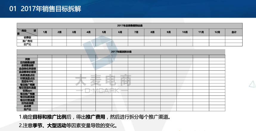 上图是2017年的销售目标拆解图,假设我明年的目标是1500万。首先,将总目标参考2016年的月销售数据分配到12个月中,确定目标和推广比例后,得出推广费用,然后进行拆分每个推广渠道。同时要注意到季节、大型活动等因素变量导致的变化。