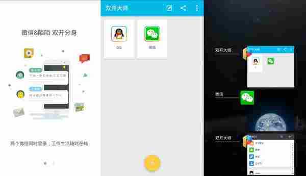 双开大师,全球最强双开引擎,安装包小至2M,应用双开同时登陆同时在线,游戏双开大小号同时在线。双开大师是一款协助您在手机上双开应用,同时登陆不同账号的应用。只需在主界面点击添加需要登录另一账号的应用,即可创建应用分身。分身应用与原始应用功能完全相同并且不同账号之间相互不影响。